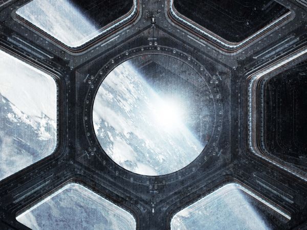 Widok na ziemię z pokładu statku kosmicznego. Dzięki tej fototapecie w Twoim domu poczujesz się tak, jakbyś sam był na statku kosmicznym.