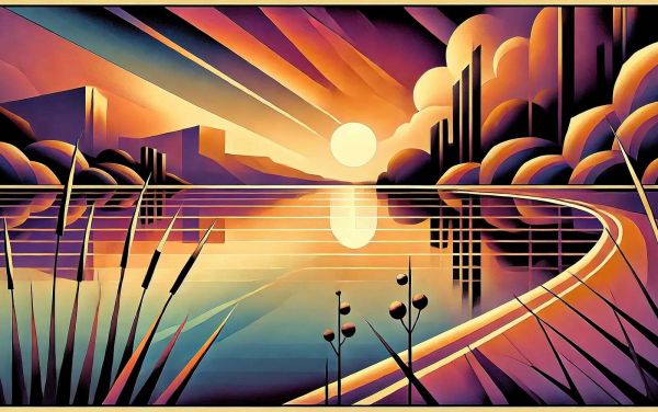 Zachód słońca odbija się na spokojnym jeziorze, otoczony stylizowanymi roślinami, falującymi kształtami i prostymi liniami. Ciepłe odcienie pomarańczy, fioletu i złota tworzą marzycielską atmosferę pełną głębi i kontrastu.