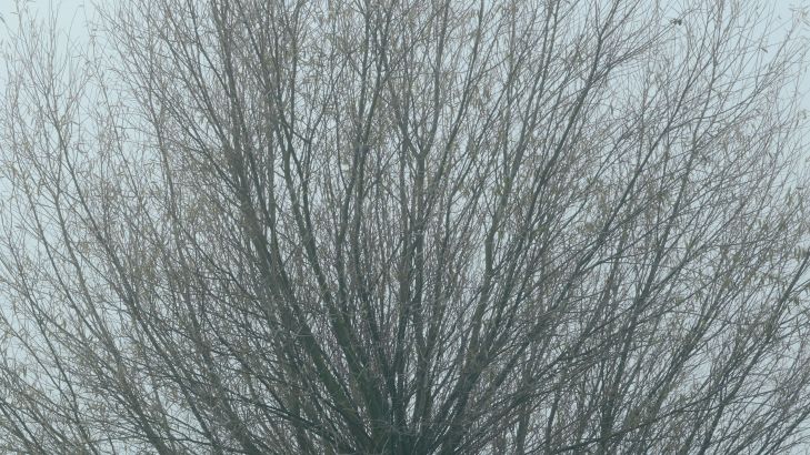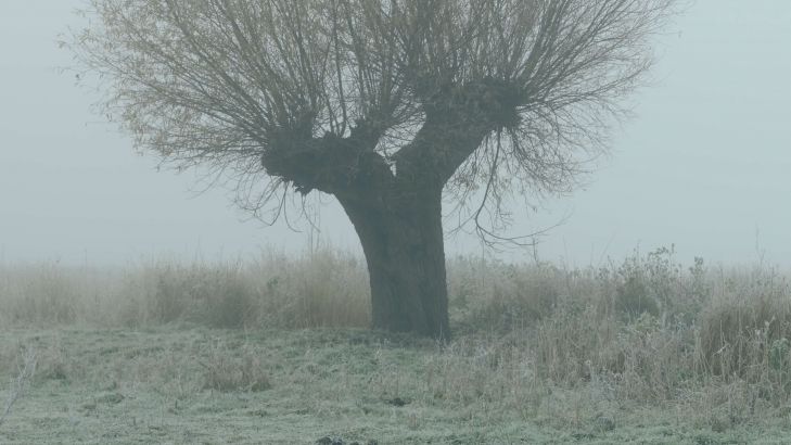 Dwie duże wierzby pollardowe w mglistym krajobrazie.