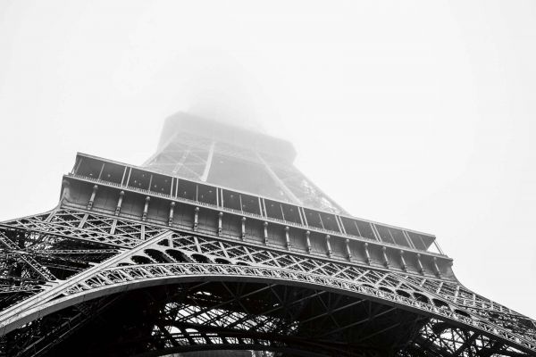 Ikoniczna wieża Eiffla wyłania się z gęstej mgły, przy czym szczyt całkowicie znika w białym niebie. Kontrast czerni i bieli podkreśla żelazne linie i nadaje obrazowi tajemniczą, filmową atmosferę.