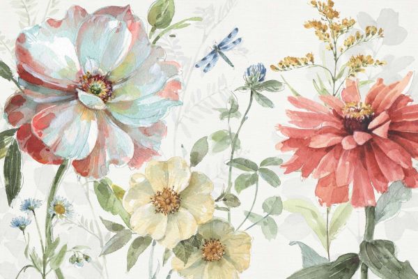 Ten artystyczny projekt uchwyca piękno letniej łąki kwiatowej za pomocą wyrazistej techniki akwarelowej. Duże kwiaty w ciepłych kolorach, takich jak czerwony, delikatny żółty i pastelowy niebieski, są w centrum uwagi, otoczone świeżo zielonymi liśćmi i delikatnie rysowanymi łodygami. Niebieska ważka unosi się między kwiatami, nadając całości lekką, naturalną dynamikę. Wyrafinowane pociągnięcia pędzla i miękkie przejścia kolorów tworzą efekt ręcznie malowany z dużą głębią i szczegółami. Ten projekt doskonale pasuje do romantycznego lub botanicznego wnętrza, w którym naturalne formy i kolory harmonijnie się łączą. Również w stylu cottagecore ten kwiecisty obrazek dodaje wnętrzu nutki nostalgii i poezji. Dla zrównoważonej całości połącz ten design z meblami z naturalnego drewna, lnianymi lub bawełnianymi tekstyliami w delikatnych pastelowych odcieniach oraz akcesoriami z ceramiki lub szkła. Kolory akcentujące, takie jak stary róż, miętowa zieleń lub musztardowy żółty, wzmacniają letnią atmosferę. Dodaj wazon ze świeżymi kwiatami lub rattanowe krzesło dla dodatkowego uroku. Idealnie nadaje się do sypialni, salonu lub pracowni, gdzie spokój i inspiracja są najważniejsze. Wzór przypomina okno na zewnątrz w słoneczny dzień i może nawet w korytarzu lub przedpokoju stworzyć ciepłą, przyjazną atmosferę. Kompozycja i kolory sprawiają, że projekt może pełnić zarówno rolę przyciągającego wzrok elementu, jak i uspokajającego tła.