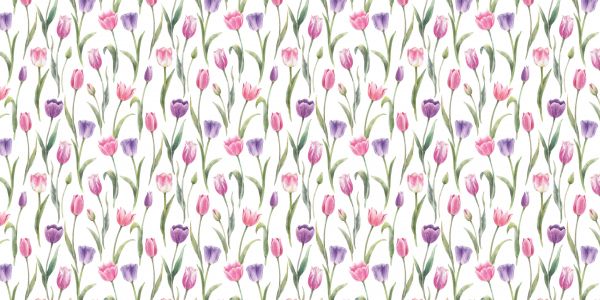 Wyrafinowana kolekcja tulipanów, przedstawiona w akwarelowych odcieniach delikatnego różu i głębokiej purpury, rozkwita na jasnym tle. Naturalna elegancja kwiatów została starannie uchwycona, gdzie pociągnięcia pędzla podkreślają delikatne przejścia i płynne kształty liści tulipanów.