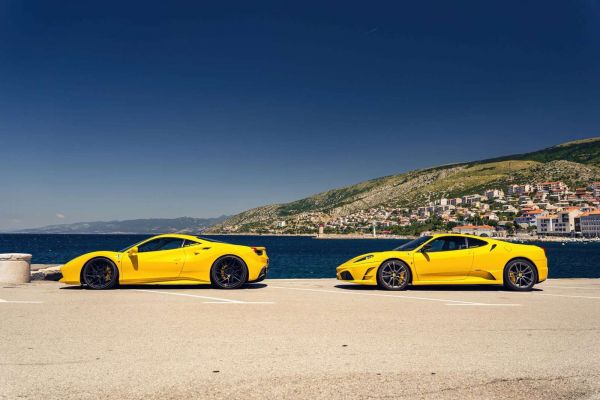 Dwa ikoniczne żółte Ferrari, 488 GTB i F430 Scuderia, emanują czystą mocą i elegancją na słonecznym wybrzeżu. Aksamitnoniebieskie morze i malownicze wzgórza stanowią idealne tło dla tych włoskich arcydzieł.