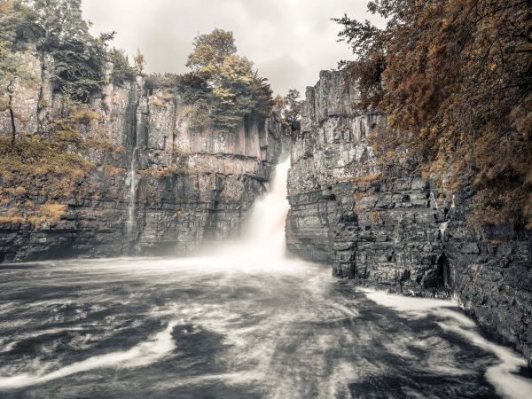 Wodospad w pochmurny dzień. Ruch wody sprawia, że wygląda on jak fantazyjny wodospad.
