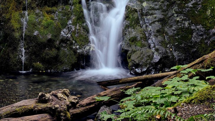 Ładny obraz wąskiego wodospadu pomiędzy zarośniętymi skałami.