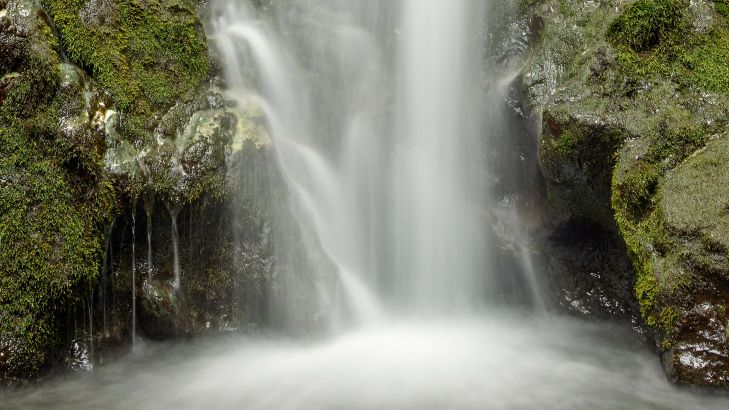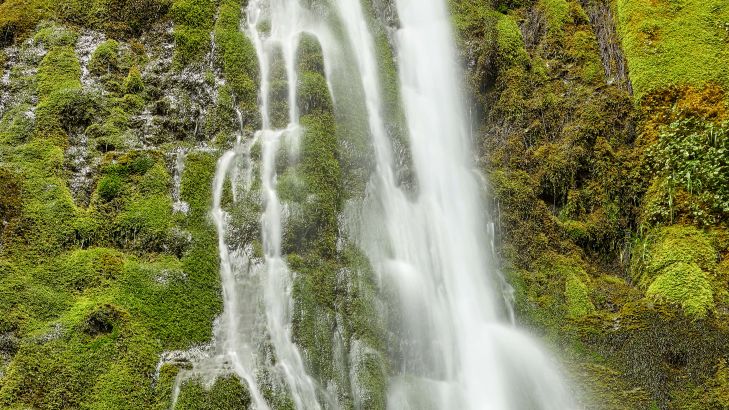 Wąski wodospad pomiędzy pokrytymi mchem skałami.