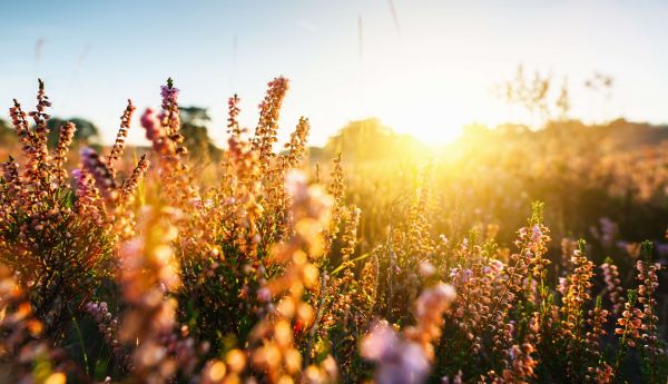 Zbliżenie wrzosowiska na wrzosowiskowym polu. W tle widzimy zachodzące słońce.