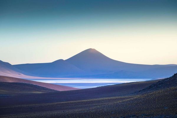 To minimalistyczny i jednocześnie majestatyczny projekt przedstawia rozległy obszar pustyni o wschodzie słońca, na którym wulkaniczne formy powoli budzą się pod coraz jaśniejszym niebem. Krajobraz składa się z warstwowych wzgórz i stoków w ziemiastych odcieniach, podczas gdy centralna, stożkowata góra delikatnie oświetlana jest przez pierwsze promienie słońca. Kolory przechodzą od głębokiego niebieskiego i indygo w cieniach, do ciepłej żółci i jasnoszarego na horyzoncie, tworząc niemalże malowniczą, spokojną atmosferę.