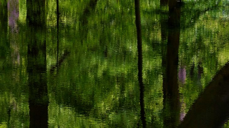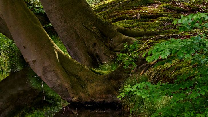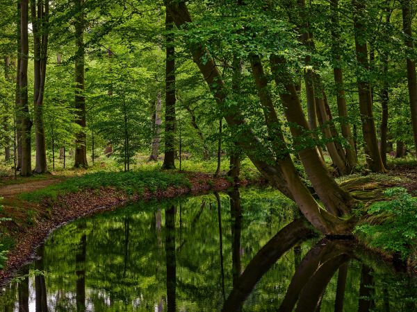 Zakrzywione drzewa w pobliżu wody z pięknym odbiciem w słoneczny dzień.