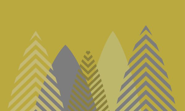 Ciemno-żółte tło z mieszanką pasiastych i kolorowych gór w różnych odcieniach szarości i żółci.