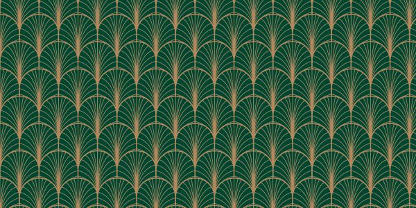 Wzór art deco w postaci złotych i zielonych pawich piór. Zastosuj tę fototapetę na ścianie, aby uzyskać jeszcze więcej atmosfery.