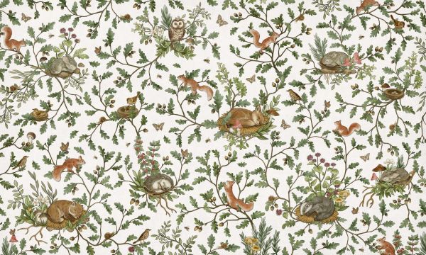 W tym żywym projekcie spokój i natura łączą się w zabawny sposób. Między świeżozielonymi liśćmi dębu i gałęziami z żołędziami i polnymi kwiatami znajdziesz kolorowe towarzystwo leśnych zwierząt: króliczki śpiące na mchu, wiewiórki szalejące po gałęziach, sowa pilnująca, oraz ptaki śpiewające w przytulnych gniazdkach. Jasne tło pozwala każdemu detalowi wyraźnie się wydobyć i nadaje projektowi otwarty i przyjazny charakter. Naturalna kombinacja kolorów miętowego, ciepłego brązu, beżu i okeru jest odświeżana przez jasną bazę. Dzięki temu projekt wydaje się zarówno zabawny, jak i ponadczasowy. Idealny do naturalnego pokoju dziecięcego, jasnego pokoju niemowlęcego, a nawet zabawnej korytarza lub kącika do czytania. Dzięki spokojnej, ale szczegółowej strukturze pozostaje wizualnie atrakcyjny, nie stając się przytłaczającym. Ilustracje są ręcznie rysowane, z dbałością o drobne detale: motyle, pszczoły, ślimaki, kwiaty, a nawet małe grzybki tworzą bogaty, pełen fantazji świat. Otwarta kompozycja sprawia, że projekt jest lekki w dotyku, podczas gdy powtarzająca się struktura gałęzi zapewnia równowagę i rytm. Ten projekt pięknie komponuje się z meblami z jasnego drewna, rattanu lub białymi. Dodatki w naturalnych odcieniach, takie jak krem, piasek, terrakota lub szałwia, wzmacniają delikatny charakter. Dodaj miękkie tkaniny, filcowy mobilny lub drewniane figurki zwierząt, aby stworzyć przestrzeń pełną spokoju, zdumienia i fantazji.