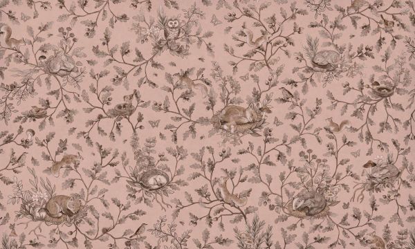 Romantyczny i nastrojowy krajobraz leśny ożywa w tym ilustracyjnym projekcie z ciepłą bazą w kolorze pudrowego różu. Pośród ozdobnych gałęzi dębów i małych kwiatów odpoczywają różne leśne zwierzęta: króliczki śpią na miękkich liściowych łóżeczkach, wiewiórki wesoło wspinają się między gałęziami, ptaki czuwają nad swoimi gniazdami, a sowa spokojnie przygląda się z wysokiego miejsca. Motyle, pszczoły, ślimaki i grzyby dodają dodatkowej magii i detali w tym starannie skonstruowanym obrazie. Tło w kolorze pudrowego różu nadaje całości delikatny, kobiecy wygląd i tworzy piękny kontrast z ciepłymi brązowymi i szarymi tonami liści i zwierząt. Ten wybór kolorów sprawia, że projekt jest idealny do romantycznej dziecięcej sypialni lub nostalgicznie wiejskiego stylu, w którym naturalne materiały i delikatne odcienie tworzą atmosferę. Każdy element jest ręcznie rysowany z dużą dbałością o szczegóły. Zwierzęta są przedstawione w spokojnym spoczynku, co nadaje spokojny wygląd idealny do pomieszczeń, w których pożądana jest intymność i spokój. Organiczna struktura gałęzi zapewnia płynny ruch przez całość, dzięki czemu wzór nie tylko dekoruje, ale także działa uspokajająco. Ładnie komponuje się z meblami z jasnego drewna, rattanu lub białymi, oraz z dodatkami w starym różu, ciepłym szarym, beżowym lub miedzi. Pomyśl o romantycznym baldachimie nad kołyską, miękkich pledach, filcowych figurkach zwierząt lub klasycznym dywanie. Idealne do pokoju niemowlęcego, pokoju dziewczęcego, przestrzeni do zabawy lub przytulnego kącika do czytania pełnego wyobraźni i spokoju.