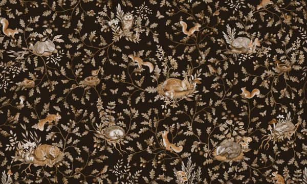 To projekt oddycha ciszą lasu, gdy zapada wieczór. Na głębokim, ciemnobrązowym tle wiją się dębowe gałęzie pełne liści, żołędzi i kwiatów. W tym nocnym lesie gnieżdżą się śpiące króliczki, ciekawskie wiewiórki, marzycielskie sówki i ptaszki w swoich przytulnych gniazdach. Każde zwierzę jest przedstawione delikatnymi liniami i bogatymi detalami, jakby właśnie wyszły ze starej książki przyrodniczej.