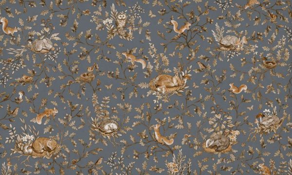 Las pełen spokoju, życia i delikatności rozwija się na tym ciepłym błękitno-zielonym tle. Między eleganckimi gałęziami dębu pełnymi liści, żołędziami i polnymi kwiatami znajdziesz śpiące króliczki, ciekawskie wiewiórki, śpiewające ptaki i sówkę czuwającą z gałęzi. Wzór pełen jest drobnych detali: małe motyle, grzybki, ślimaki, pszczoły i kwitnące rośliny nadają projektowi bogaty, żywy wygląd.