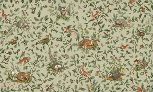 To urocze wzornictwo ożywia magiczny krajobraz leśny, w którym króliczki, wiewiórki, sowy i ptaszki ukrywają się między bujnymi gałęziami dębów i delikatnymi kwiatami. Tło ma spokojny odcień zieleni, który pięknie podkreśla ciepłe kolory zwierząt i głębokozielone liście. W całym wzorze znajdziesz małe opowieści: śpiącego królika na łóżku z mchu, sowę na gałęzi pełnej kwiatów, gniazdko młodych ptaków oraz wesołe wiewiórki, które skaczą między żołędziami i motylami.