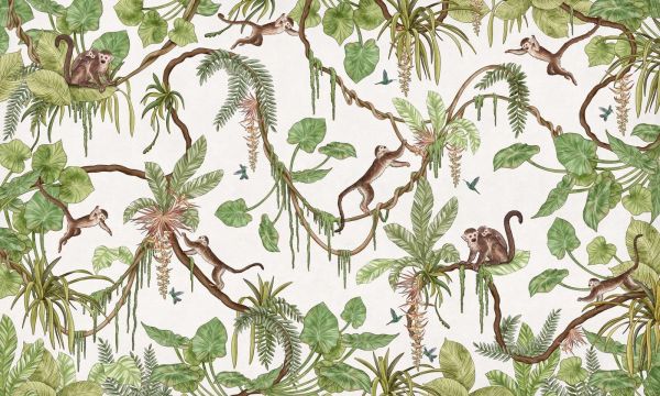 Żywe małpy bawią się między tropikalną zielenią, kwiatami i pniami na świeżym białym tle. Projekt emanuje radość, naturalność i jasność dzięki delikatnym odcieniom zieleni i ciepłym brązowym akcentom.