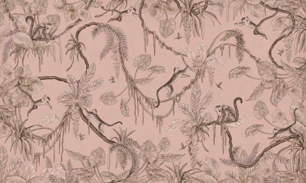 To urocze wzornictwo przedstawia zabawny pejzaż dżungli, ukazany w ciepłej palecie kolorów pudrowego różu. Tło emanuje spokojem i delikatnością, podczas gdy drobne linie w brązowych i sepii wypełniają obraz życiem i detalami. Między dużymi liśćmi, smukłymi pniami i egzotycznymi kwiatami ciekawskie małpki płynnie poruszają się przez dekoracje — skaczą, wspinają się lub odpoczywają z młodymi, nadając wzornictwu zabawny, ale kochający ton. Użyta paleta kolorów nadaje temu motywowi dżungli zaskakująco wyrafinowany wygląd: róż jest delikatny i stonowany, nie słodki, stanowi idealne tło dla elementów dżungli, które harmonijnie płyną po powierzchni w linii. Ten wzór doskonale wpisuje się w romantyczne botaniczne lub delikatnie eklektyczne wnętrze. Połącz go z meblami z naturalnego drewna, tekstyliami z lnu lub bawełny oraz dodatkami w odcieniach brązu, beżu lub rdzy, aby stworzyć ciepłą, zrównoważoną atmosferę. Również pięknie prezentuje się z akcentami miedzianymi lub zabytkowym mosiądzem. Doskonale nadaje się do pokojów dziecięcych, kącików zabaw lub pokojów dziecięcych z unikalnym akcentem. Wzór jest na tyle zabawny, aby pasował do środowiska dziecięcego, ale na tyle stylowy, aby można go było zastosować także w ustawieniu dla dorosłych — np. jako ściana z charakterem w sypialni, butikowym hotelu lub przytulnym gabinecie. Połączenie zabawnych zwierząt, naturalnych kształtów i delikatnych kolorów sprawia, że ten wzór staje się subtelnie przyciągającym wzrok elementem — dżunglową opowieścią z wyrafinowaną, ciepłą duszą.