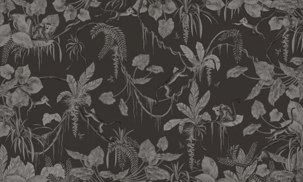 To intrygujące wzornictwo uchwyciło uczucie tropikalnej dżungli nocą. Na głęboko czarnym tle rozgrywa się życie dżungli w wyrafinowanych odcieniach szarości, gdzie małpy z gracją poruszają się między bujnymi liśćmi, wijącymi się pniami i kwitnącymi helikoniami. Styl monochromatyczny wzmacnia tajemniczy charakter wzornictwa: jest bogaty w detale, ale pozostaje stonowany i stylowy. Małpy dodają dynamiki całości - machają, odpoczywają i eksplorują korony drzew, podczas gdy między gałęziami pojawiają się także tropikalne ptaki i motyle, subtelnie wplecione w grę linii. Idealne do nowoczesnych, eleganckich wnętrz botanicznych, gdzie głębokie kolory, tekstura i kontrast łączą się. Połącz ten wzór z aksamitnymi tkaninami, ciemnymi gatunkami drewna, akcentami mosiądzu lub naturalnym kamieniem, aby stworzyć wyrafinowaną, nastrojową przestrzeń. Ten wzór doskonale sprawdzi się jako ściana akcentowa w salonie, sypialni lub stylowym biurze. W restauracji lub hotelowym pokoju z charakterem stanowi silne, ale uspokajające oświadczenie. Ciemne tło tworzy intymną, niemal teatralną atmosferę, która otacza i pobudza. Dla tych, którzy lubią odważne wzornictwo z naturalną elegancją, to wyjątkowy wybór: dżungla, ale z dojrzałym, wyrafinowanym zacięciem. Wizualny martwy punkt, który wciąż fascynuje.