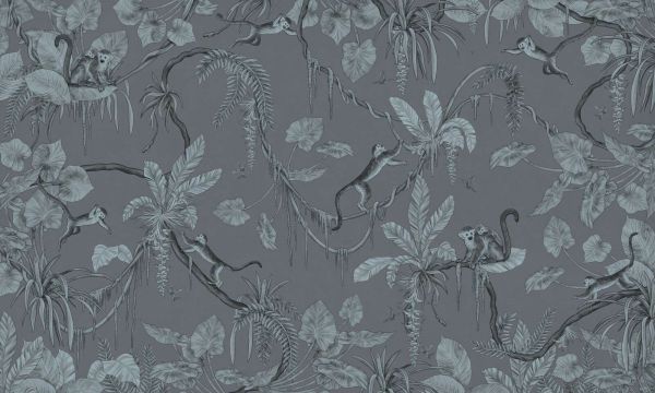 Małpy machają się po bujnym tropikalnym krajobrazie, narysowane w stylowych niebiesko-szarych tonach. Spokojne tło i stonowane kolory nadają projektowi spokojny, elegancki charakter dżungli z zabawnymi detalami.