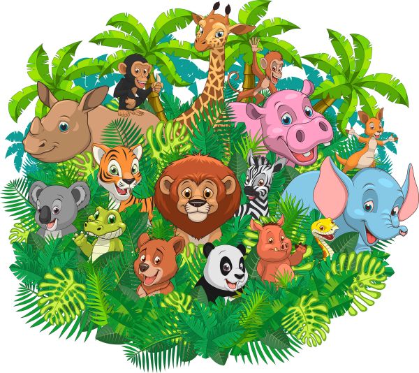 Fototapeta wielu różnych zwierząt dla dzieci. Połącz to w pokoju dziecięcym.