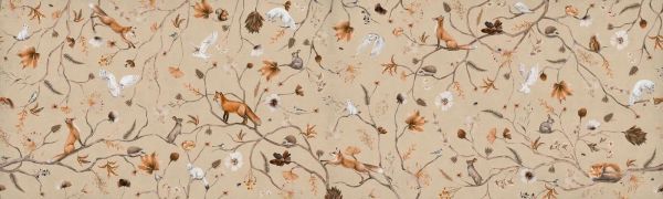 Wyrafinowany wzór lisów, sów, królików i wiewiórek, delikatnie wpleciony między cienkie gałęzie i jesienne liście na ciepłym beżowym tle. Cicha, nastrojowa scena pełna detali i piękna natury.