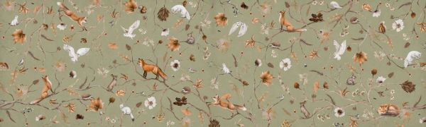 To ciepłe i zabawne sceny ożywiają żywy krajobraz leśny, z bogatą kolekcją zwierząt, które chowają się, odpoczywają i bawią między subtelnie rozgałęzionymi kwiatami i liśćmi. Lisy skaczą i czają się, białe sowy delikatnie unoszą się nad kompozycją, podczas gdy króliki, łasice, wiewiórki i ptaki śpiewające subtelnie rozproszone są między kwiatami w miękkich odcieniach brązu, rdzy i kremu. Tło to delikatny oliwkowy kolor, który idealnie kontrastuje z ciepłymi odcieniami listowia i jednocześnie emanuje spokojem i wyrafinowaniem.