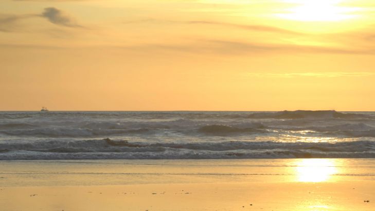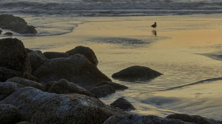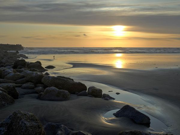 Piękny zachód słońca na plaży z długim rzędem dużych kamieni po lewej stronie.
