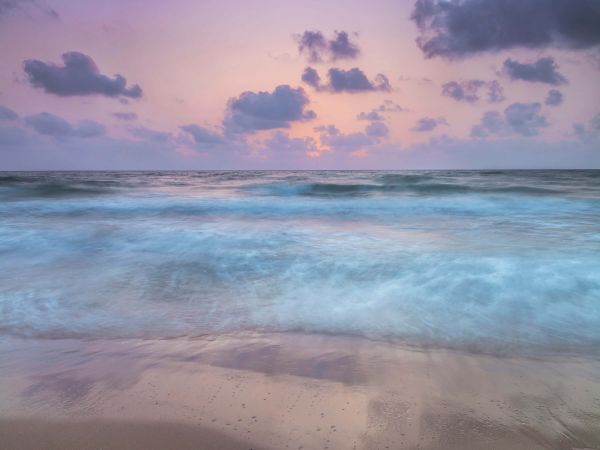 Piękny kolorowy zachód słońca na plaży. Fale napływające na plażę.