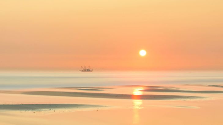 Piękny, zwiędły krajobraz z zachodem słońca w kolorze pomarańczowym i statkiem na horyzoncie.