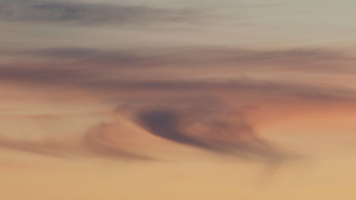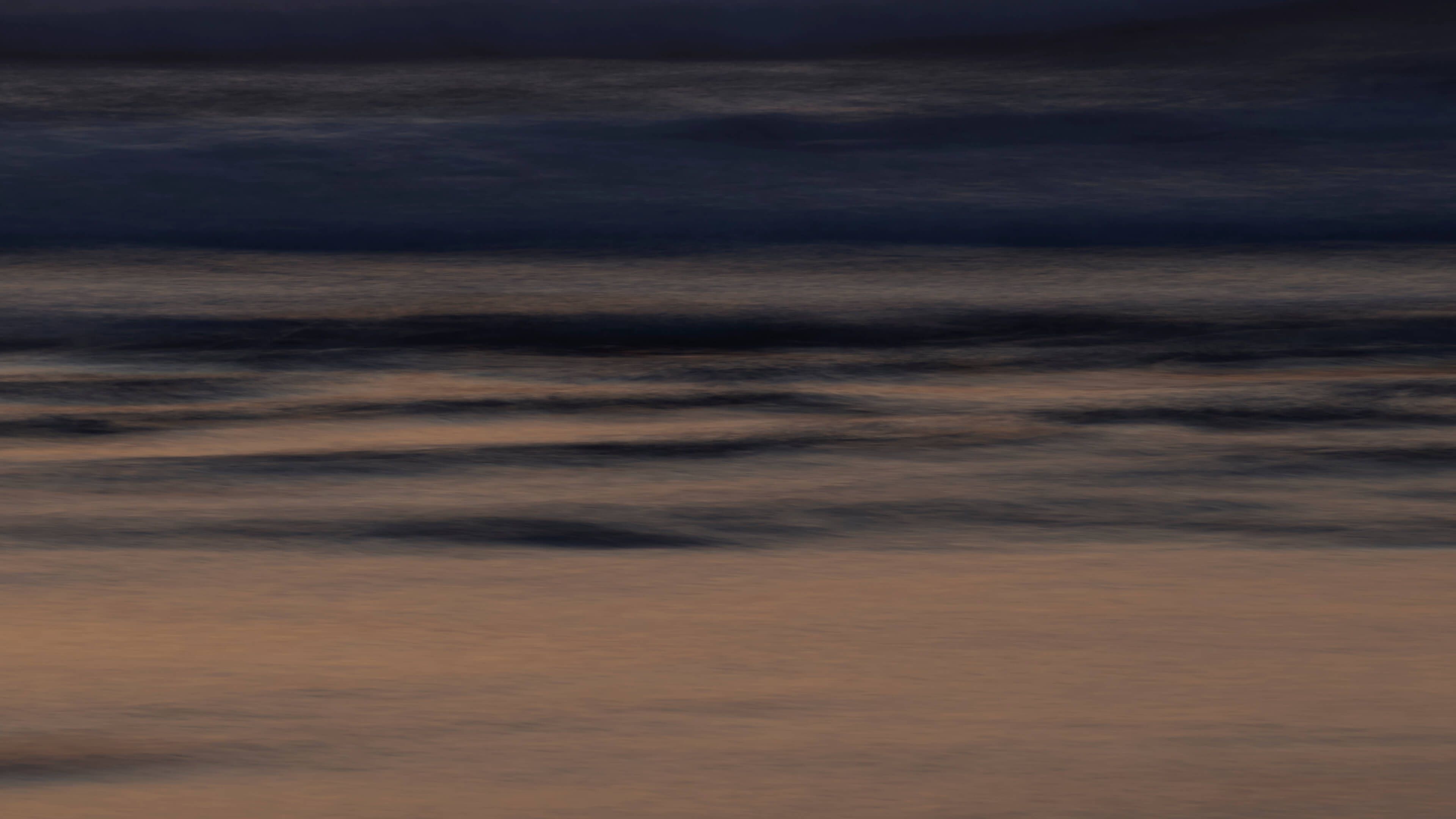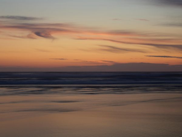 Zachód słońca na wybrzeżu z niskimi wiszącymi chmurami.
