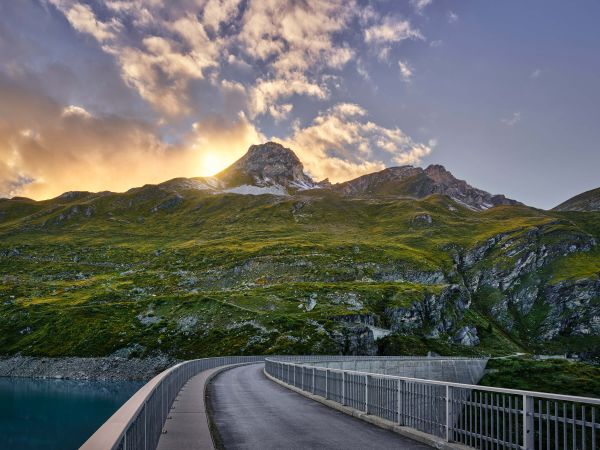 Piękny zachód słońca nad jeziorem. Z tą fototapetą w Twoim domu, to tak jakbyś mógł przejść przez most.