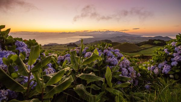 Fototapeta zachód słońca w Portugalii z fioletowymi hortensjami. Połącz to w jadalni.