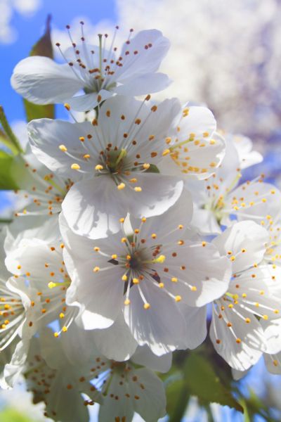 Zbliżenie na białe japońskie kwiaty z zielonymi liśćmi.