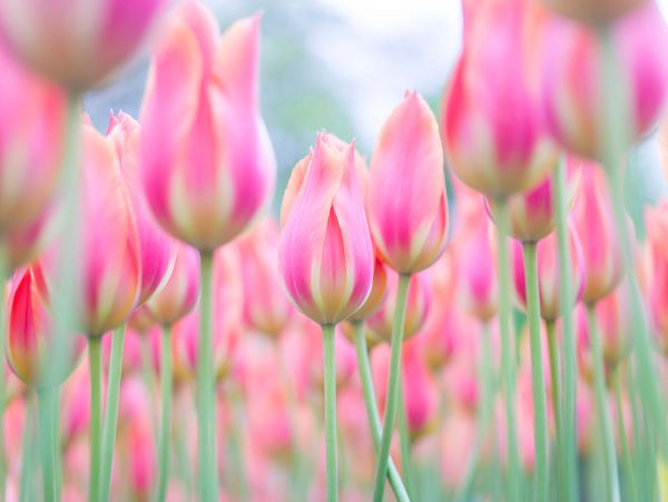 Piękne zbliżenie różowych tulipanów na polu tulipanowym. Połącz tę fototapetę w swoim domu, aby uzyskać jeszcze większą atmosferę.