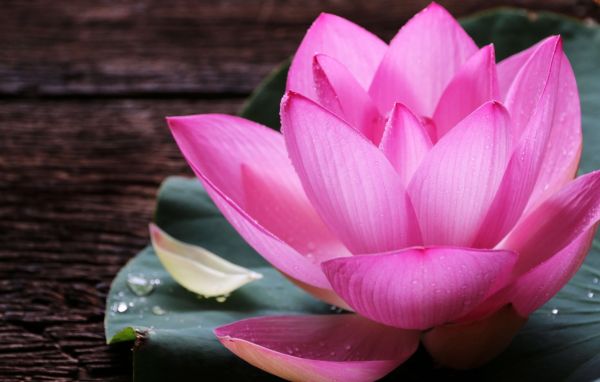 Różowy kwiat lotosu z ciemnym drewnianym tłem.