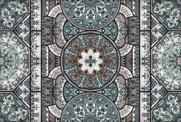 Bogaty, symetryczny wzór kafelkowy z mandalami, eleganckie zawijasy i geometryczne pola w odcieniach głębokiej zieleni, kremu i ciepłych brązów. Wyrafinowane detale i klasyczna kompozycja nadają całości elegancki i rzemieślniczy charakter.