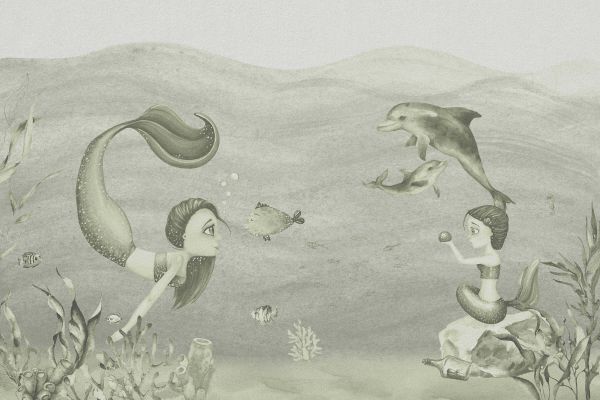 Zwierzęta podwodne z dwiema małymi syrenkami w kolorze zielonym.