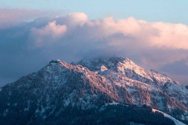 Wspaniały krajobraz górski otulony delikatnym różowym blaskiem, zasłonięty zaśnieżonymi lasami sosnowymi i wymarzonym wieczornym niebem. Światło tworzy spokojną, niemal baśniową atmosferę pełną spokoju i siły.
