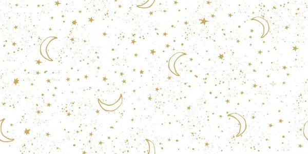 Wyrafinowany wzór złotych sierpów księżyca i migoczących gwiazd na jasnym tle. Subtelne rozbryski i figlarne kształty tworzą marzycielską i spokojną atmosferę.