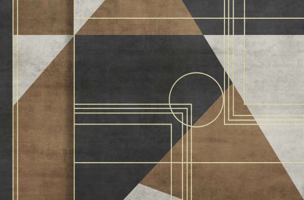 Ścisła geometryczna gra kół, linii i płaszczyzn w czerni, brązie i betonowej szarości. Złote linie nadają wyrafinowany akcent art deco, podczas gdy kompozycja wprowadza równowagę i głębię w każde wnętrze.