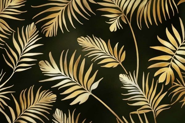 Intrygujący wzór palmowych liści w głębszym złotym metalicznym odcieniu, połączony z intensywnie ciemnym tłem. Przytłumiony blask ciemnego złota tworzy subtelną i tajemniczą atmosferę, która wygląda zarówno elegancko, jak i egzotycznie.