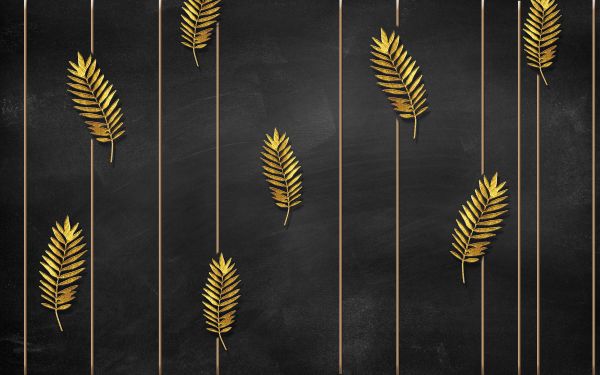 Złote liście tropikalne na czarnym tle. Ciemne tło sprawia, że liście wyróżniają się jeszcze bardziej.