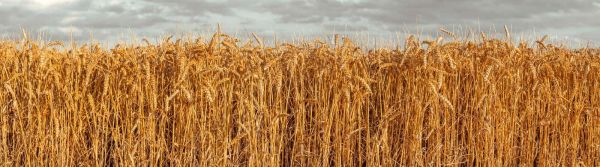 Rozległe pole złocistej pszenicy pod dramatycznym, szaro zachmurzonym niebem. Źdźbła kołyszą się dostojnie na wietrze, ożywiając rustykalny, wiejski nastrój pełen ciepła i uczucia pory roku.