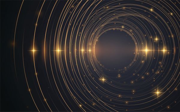 Ciepły tunel oświetlony złotymi pierścieniami.