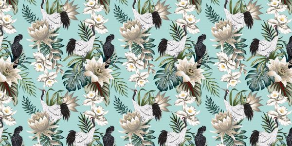 Tropikalne żurawie i papugi na fototapecie z kolorowymi liśćmi.