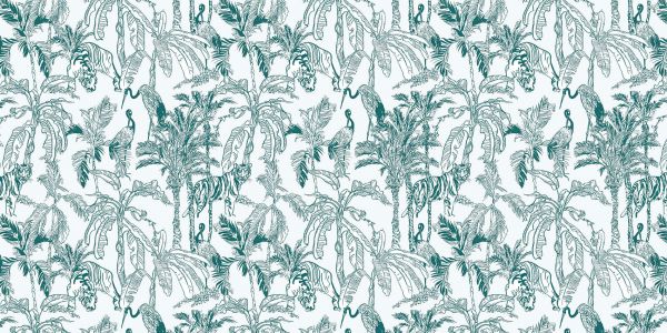Wzór zielonych żurawi i tygrysów z egzotycznymi roślinami.
