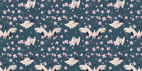 Wzór żurawi w pobliżu różowych kwiatów magnolii.