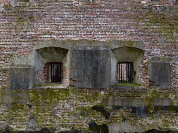 Stara, ceglana ściana z 2 niszami. Na starej ścianie zaczyna już rosnąć mech.